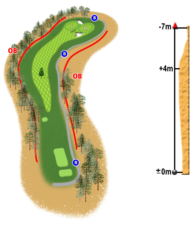 思ったより曲がりが浅いのでショートカットは危険。 第2打からは打ち下ろしの距離感に注意しながら グリーン左サイドから攻めたい。