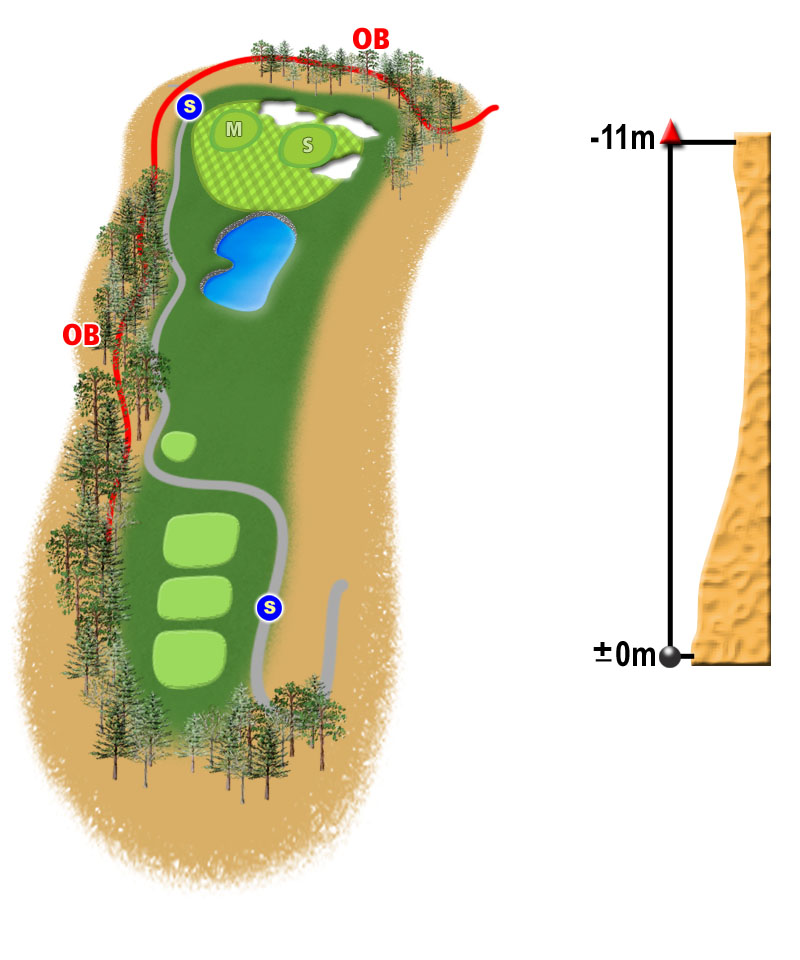 打ち下ろしのショートホール。左にはOBがあり、砲台グリーンのためセンターより左を狙いたい。
